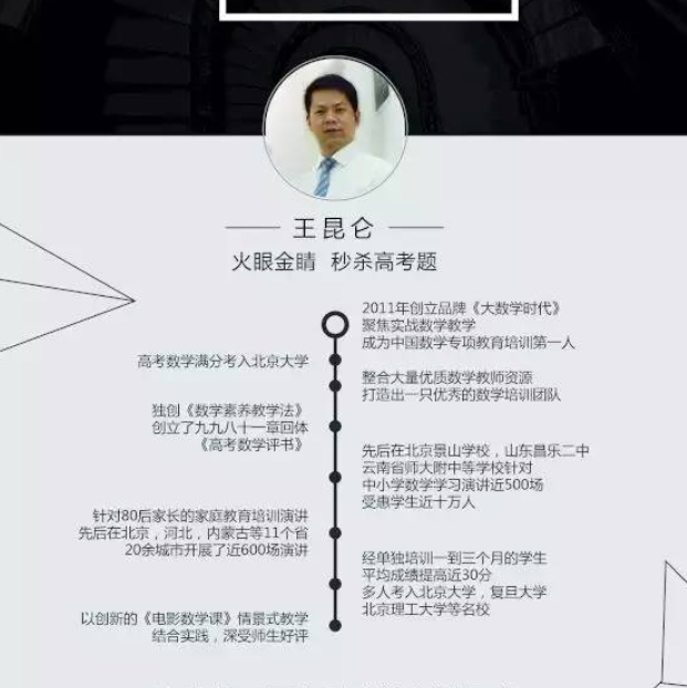 ——他就是素质教育资深专家、以数学高考满分成绩考上北大的高材生——王昆仑老师!王昆仑老师曾在北京著名的景山学校开讲公开课,受到校长的高度评价。