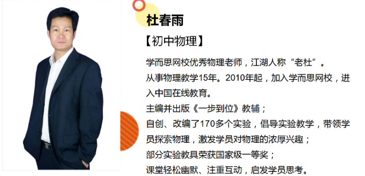 杜春雨,男,学而思网校初中物理教师。2010年成为学而思网校优秀教师,并主编出版《一步到位》教辅。