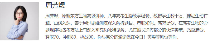 周芳煜周芳煜,原新东方生物高级讲师,八年高考生物教学经验,教授学生